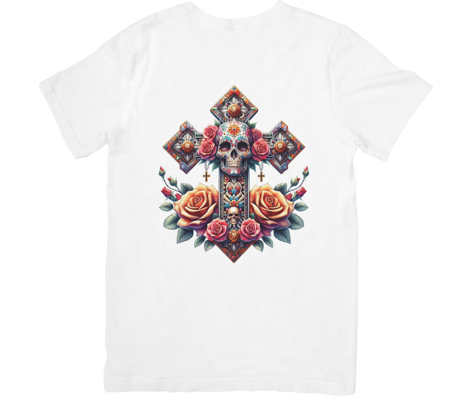 El diseño de la Calavera Cruz está cuidadosamente pensado para resaltar los elementos más representativos de la celebración del Día de Muertos. Desde detalles de calaveras elaboradas con patrones culturales auténticos hasta una paleta de colores que celebra la alegría de la vida, esta playera es más que una prenda, es un homenaje. Una elección ideal para los amantes del arte, la historia y la tradición mexicana.